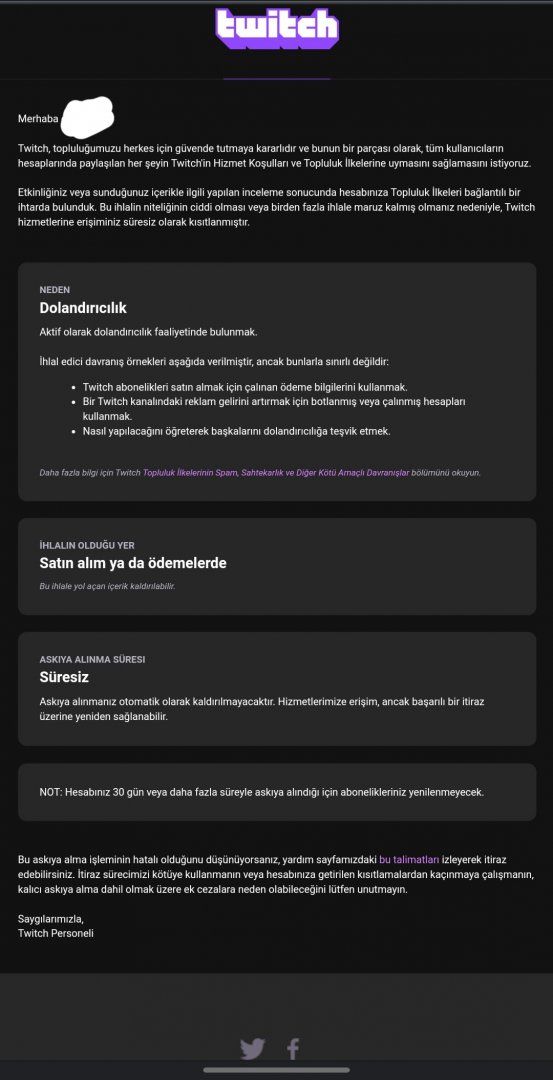 Arkadaşlar 10 dakika önce mail adresime Twitch'den mail geldi. Hesabım süresiz askıya alınmış. Sebep olarak dolandırıcılık yazıyor ama Elraenn'in yayınlarını izleyip çıkıyorum, Elraenn'de zaten hem abone modunda. Cheate bir şey yazmıyorum yani anlayacağınız. Dolandırıcılık derken neden bahsediyor? Üstüne üstlük itiraz da edemiyorum süresiz olduğu için. Nasıl düzeltirim durumu?
