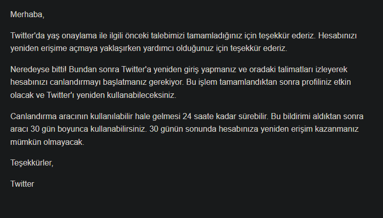 Sorun çözüldü. İleride benzer durumları yaşayabilecekler için süreci anlatayım. Kimlik fotoğrafını gönderdim sonrasında yaklaşık 2 saat içerisinde hesabınız Twitter'a kayıt olurken 13 yaşından küçüktünüz. 13 yaşından küçükken atılan tweet vb. silinerek tekrar kullanabilmeniz için hesap canlandırma aracını 24 saat içinde aktif edeceğiz diye mail yolladılar. Yaklaşık 14 saat sonra hesap canlandırma aracı aktif edildi. Aracı açtığınızda 13 yaşından küçükken hesapta atılan tweet, favori vb. için silme onayı istiyor. Onayı verdikten sonra 2 dakika içinde hesap açılıyor.