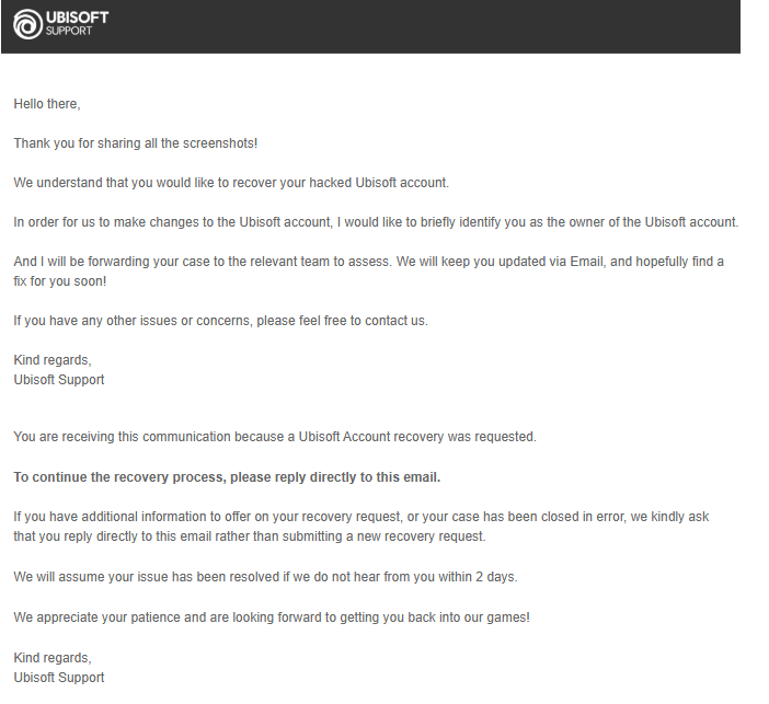 Benim bilgisayara giren virüs nedeni ile birçok hesabımda Steam de dahil işlemler yapıldı. Sanırım bir bot tarafından yapılmış. Bende ticket oluşturdum Ubisoft'a Steam satın alma geçmişinden makbuzu buldum attım işte R6 ile Steam bağlamıştım oyun saatimi falan gösterdim. Daha önce gelen mailleri hatta gece yarısı değişiklik olduğunda gelen mailleri SS attım. Hatta şifre ve 2 faktörlü doğrulamanın kaldırıldığı IP adresini mail ile bana atmışlar * şeklinde kapatarak, bunu Ubisoft biliyor yani onlarda söyledim her zamanki adresimden çok farklı bir yerde bir işlem yapıldığı ortada. Birkaç kere denedim siz olduğunuzu doğrulayamadık dediler. Ben hatta profil resminin ve kullanıcı adının ne olduğunu da atmıştım. En son kariyerimden vazgeçmemi bekliyorsunuz falan diyerek tüketici mahkemesine gideceğimi söyledim ve buna yanıt olarak şunu atmışlar. Bekliyorum falan diye geri döndüm. Umarım alabilirim.