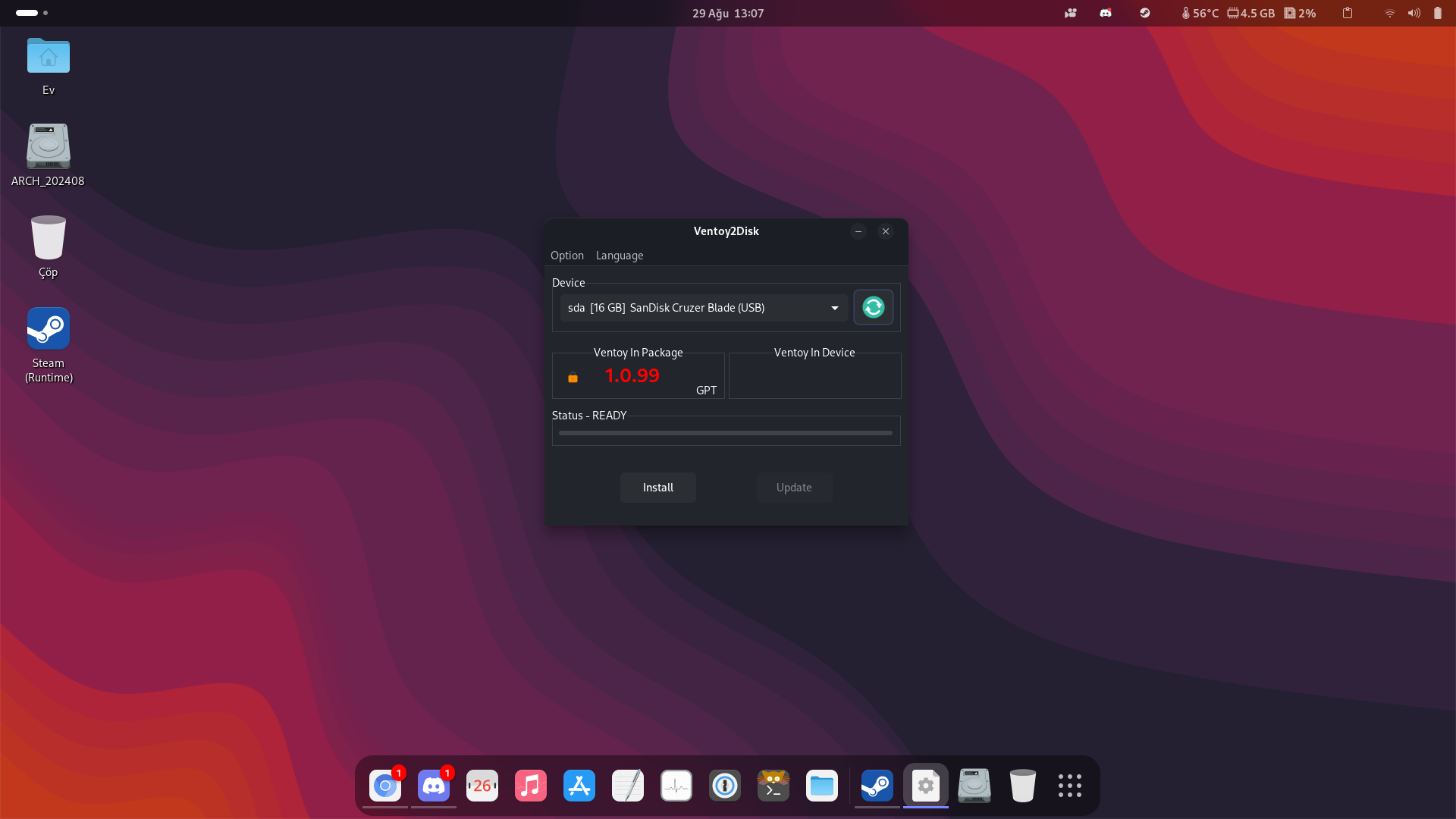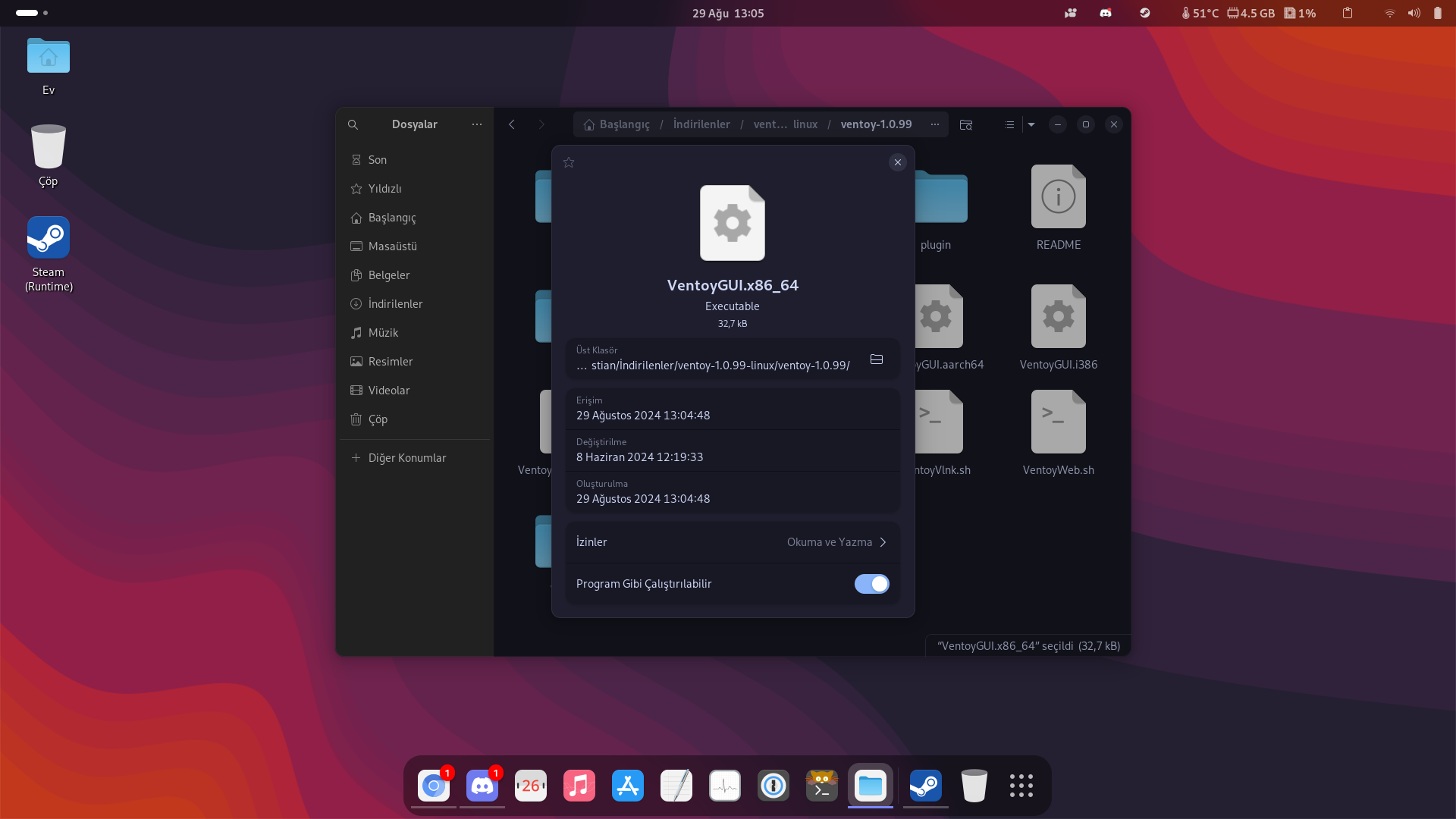 Görseldeki isme sahip dosyaya sağ tık yapıp özellikler'e tıklayın ve program gibi çalıştırılabilir seçeneğini etkinleştirin. Ardından ventoyguı. X86_64 adlı dosyaya çift tık yapın. Ventoy kurulum ekranı açılacaktır.