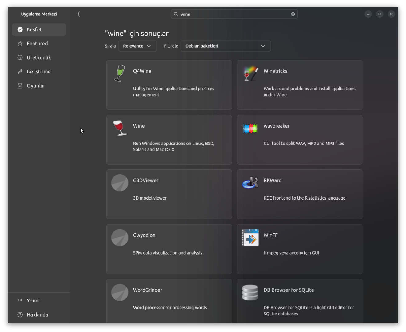 Uygulama merkezine gir, WINE'ı arat. Filtre olarak Debian paketlerini seç. Wine ve Winetricks'i kur.