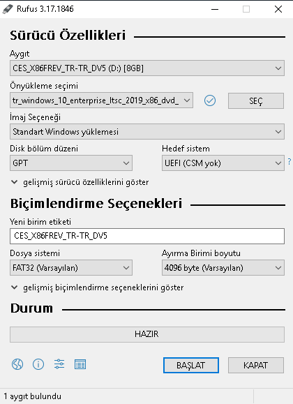 Son sürümde FAT32 seçemez. Dosya boyutu çok büyük. NTFS seçmesi lazım.