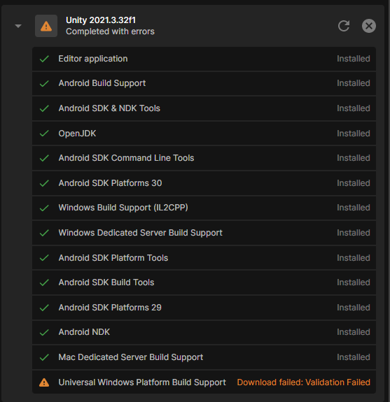 Arkadaşlar merhaba. Unity 2021.3.32F1 sürümünü indirirken "Universal Windows Platform Build Support" eklentisi "Download failed: Validation Failed" hatası verdi. Unity Hub'ı yönetici olarak çalıştırdım ancak yine düzelmedi. İnternetten baktığımda Unity'nin sitesinden manuel olarak indir diyorlar ancak. Bu kadar indirme boşa gidecek. Hatanın ekran görüntüsü: