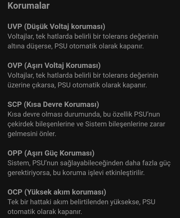 SCP, OCP, OVP, UVP, OPP koruması olan PSU için UPS almak gerekli mi? Açıklamalarını aşağıdaki görselde bulabilirsiniz.