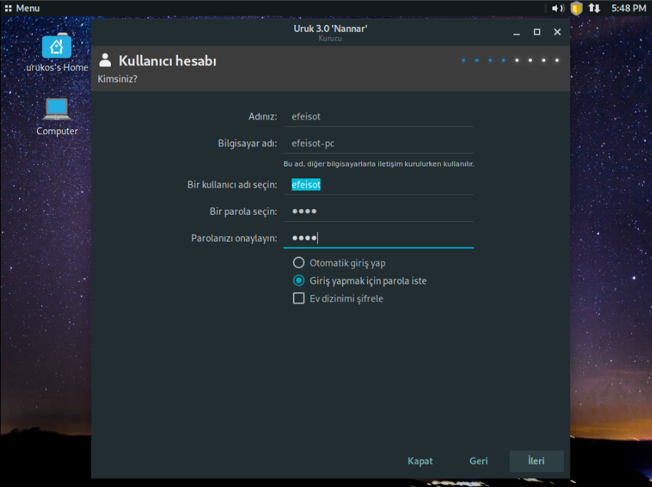 Gelen ekrandan kullanıcı hesabımızı ve şifremizi oluşturuyoruz. İsteğe bağlı ev dizininizi (/home klasörü) şifreleyebilirsiniz. Tavsiyem şifrenizi uzun ve karmaşık tutmanız.