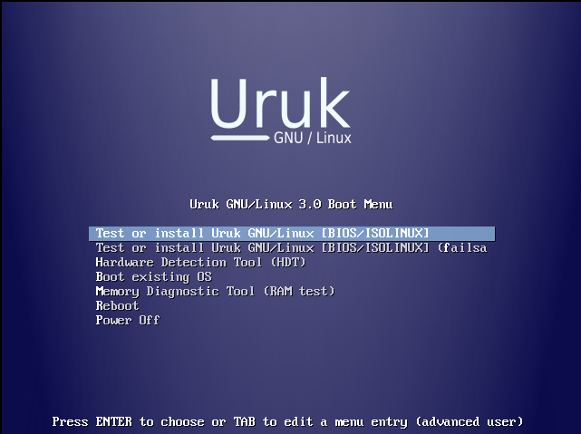 Nihayet sistemimimiz açıldı. Menüden ınstall uruk GNU/Linux yazarak yükleyiciyi açıyoruz.