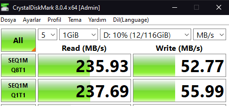 Buyur USB 3.2 portunda aldığım hız.Yazma hızı nedir hocam bunun? CrystalDiskMark test sonucu var mı?