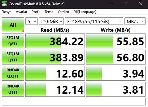 Bu da Diskmark'ın sonuçları. Aktarım hızı yavaş değil mi?