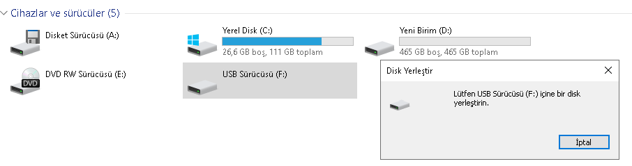 USB bellekte "Lütfen bir disk yerleştirin" hatası