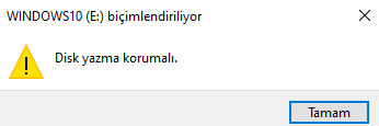 Hocam biçimlendiremiyor. Çünkü Disk yazma korumalı. Hatta fotoğrafda da denemiş biçimlendirmeyi.Usb yi biçimlendirin.