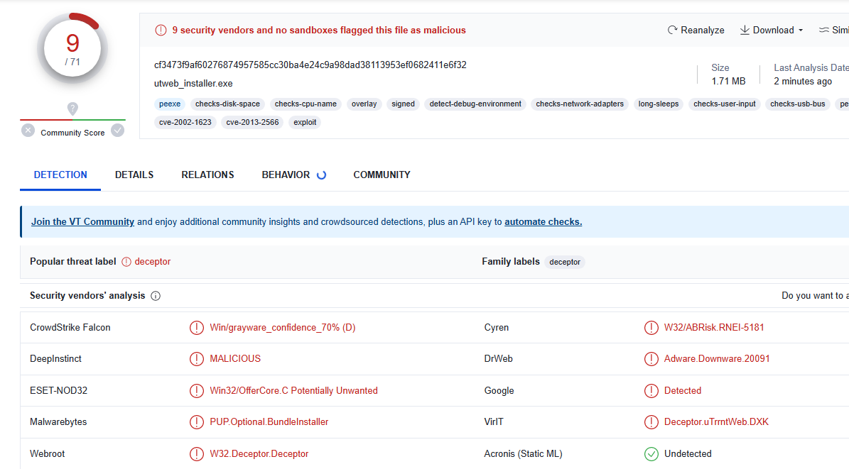 Virüs yok çoklu yükleyici olduğunu söylüyor. Kurarken her şeye next next demeyin. Arada başka şeylerde olabilir.uTorrent resmi sitesinden indirdim, dosyayı VirusTotal'de tarattım sonuç böyle. Sizce indirmeli miyim zararlı mıdır?