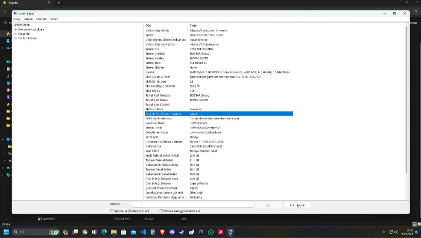 Merhaba herkese iyi Sosyaller. Yeni toplamış olduğum bir sistemim var ve Valorant indirdim fakat giremiyorum, oyun açılıyor ardından 9003 kodlu güvenli ön yükleme hatası alıyorum. Güvenli ön yüklemeyi BIOS'tan açıyorum fakat yine de kapalı kalıyor, akşamdan beri farklı farklı yöntemler denedim fakat yine de açamadım. Anakartım BIOSTAR B650M-Silver işlemci R7 7800x3D. Yardımcı olabilecek fikirleriniz ve önerileriniz varsa paylaşabilir misiniz?