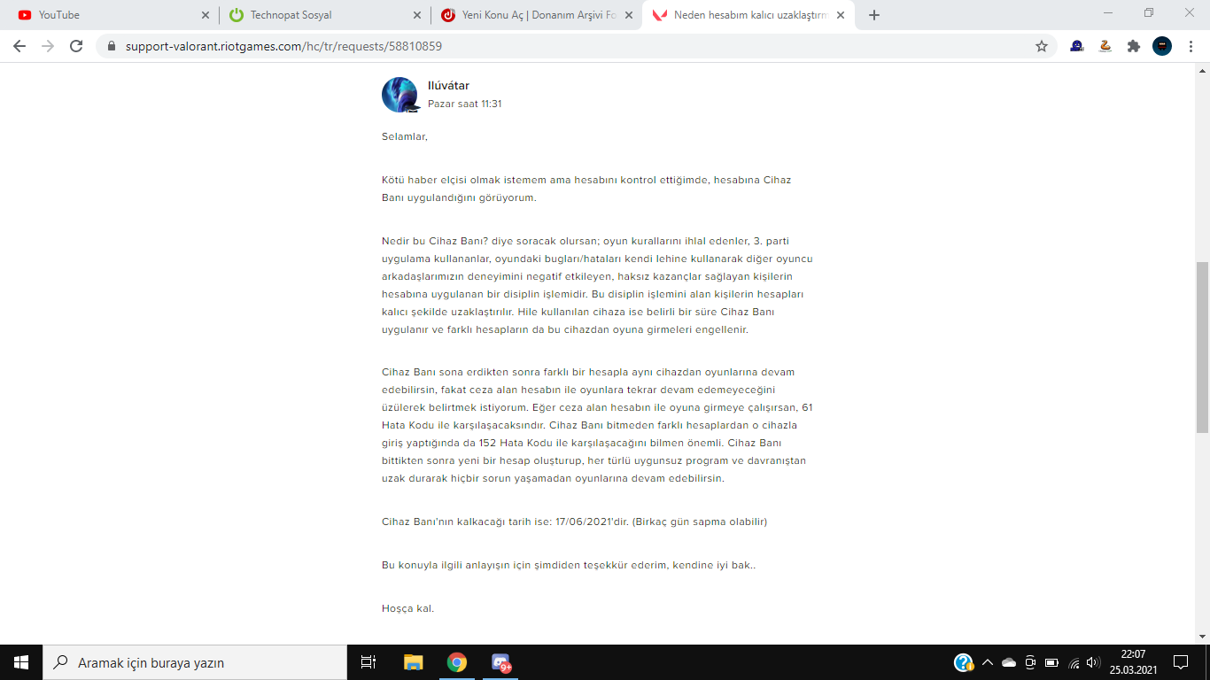Selam dostlar. Bundan 5 gün önce hesabıma girmeye çalıştığımda koskoca "hesabınız kalıcı olarak uzaklaştırıldı!" hatasıyla baş başa kaldım. Desteğe ticket atmadan önce yeni hesap oluşturmuştum. Onda sorunsuz giriliyordu (tabi daha destek mesaj yazmamıştı.). Ondan sonra desteğe bir ticket attım 3 gün içerisinde ulaştılar ve şu mesajı attılar. 3 ay ban yediğim gözüküyordu fakat ben hala oyuna girebiliyordum? Ne olduğunu anlamadım ve şu an yeni hesabımla oynamaya devam ediyorum. Sorularınız varsa açığım iyi forumlar.