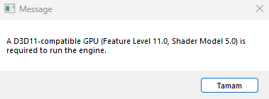 Diye bir hata çıkıyor araştırdım Direct X 11 desteği olmayan ekran kartı varsa uyarı çıkıyormuş fakat benimki DirectX 12 Ultimate destekliyor. Az önce kontrol ettim.