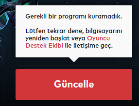 "Gerekli bir programı kuramadık. Lütfen tekrar dene, bilgisayarını yeniden başlat veya Oyuncu Destek Ekibi ile iletişime geç."
