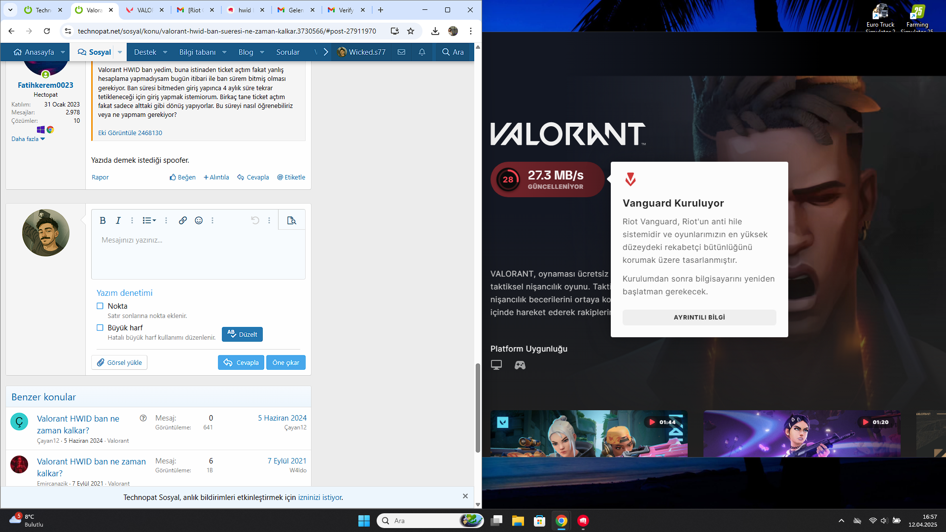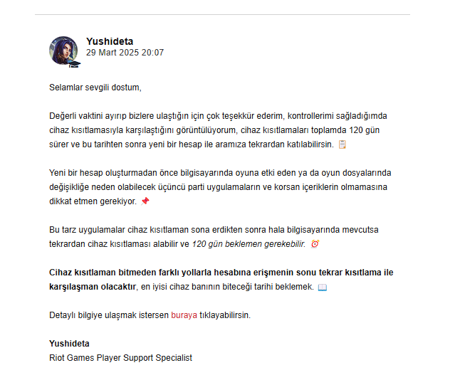 Valorant HWID ban yedim, buna istinaden ticket açtım fakat yanlış hesaplama yapmadıysam bu gün itibari ile ban sürem bitmiş olması gerekiyor. Ban süresi bitmeden giriş yapınca 4 aylık süre tekrar tetikleneceği için giriş yapmak istemiorum. Birkaç tane ticket açtım fakat sadece alttaki gibi dönüş yapıyorlar. Bu süreyi nasıl öğrenebiliriz veya ne yapmam gerekiyor?