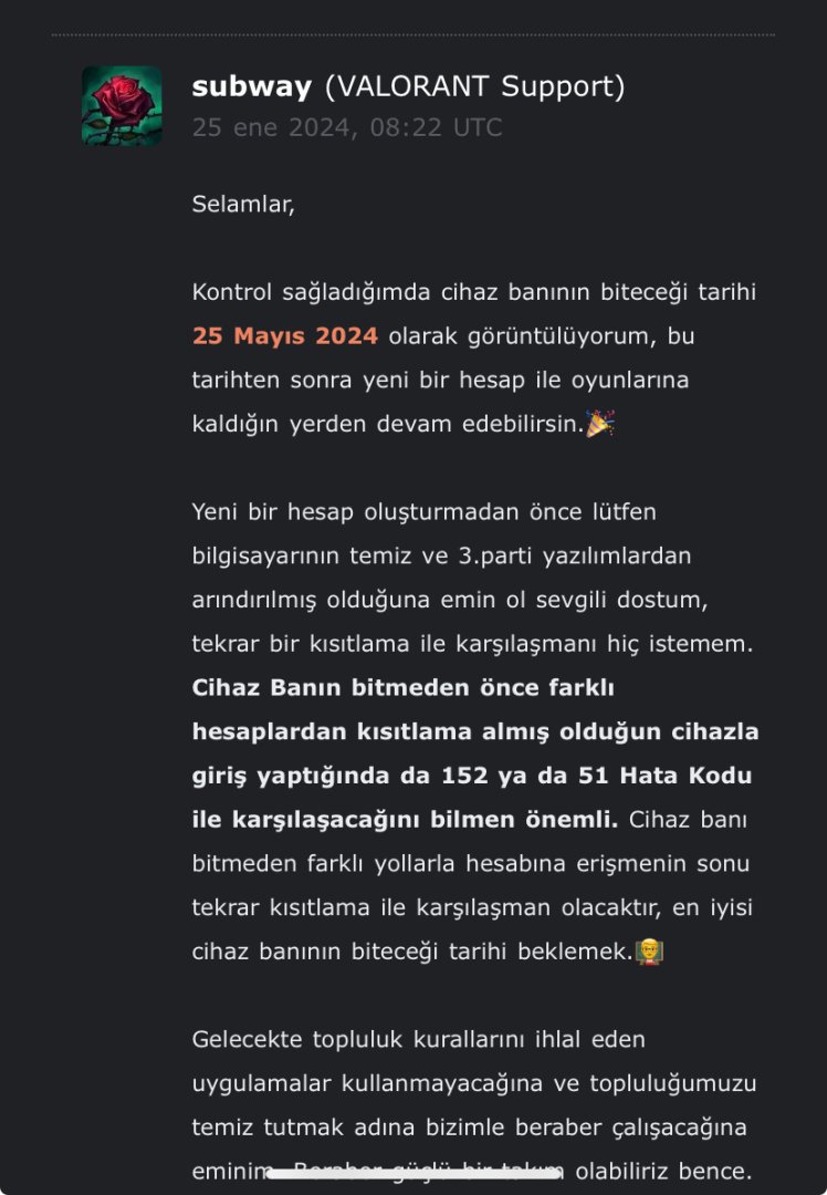 Merhaba arkadaşlar. Valorant'tan 1 ay 10 gün önce hesabım kalıcı olarak uzaklaştırma yedi üstüne normal olarak HWID ban yedim. Riot'a ulaşarak hesabımın kalıcı uzaklaştırılması kaldırıldı ban kalktıktan sonra hiç hesaba ve oyuna girmedim. Bilgisayarıma format attım 1 hafta güzel bir şekilde o ban yiyen hesapta oynadım fakat garip bir şekilde sabah kalktığımda PC banım vardı oysaki ben HWID banın kalktığını zannediyordum. Şu anda hesabımın banı yok fakat HWID banım var. Benim sorum HWID ban 29.01.2022 de bitecek ben HWID banım bitince o hesaba girmeye devam etmeli miyim yoksa yeni hesap mı oluşturayım?