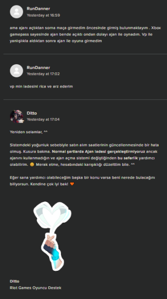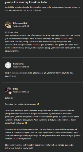 Neyse karakteri XBox Pass ile oynama hakkına sahip olsam da o andan itibaren hiç oyuna görmedim. Tickete ilk gelen bot cevabından sonra cevap veren arkadaş, karakteri kullanmış olduğum için iade yapamayacağını söyledi, sinirlerim bozuldu ama sakin kalıp, cevabını gözden geçirmesini, karakteri XBox ile oynadığımı, VP ile aldıktan sonra hiç oynamadığımı bir kez daha belirttim. Sonrasında başka bir temsilci gelip, killjoy edası ile yaptığı inceleme sonucunda haklı olduğuma kanaat getirip iadeyi yaptı.