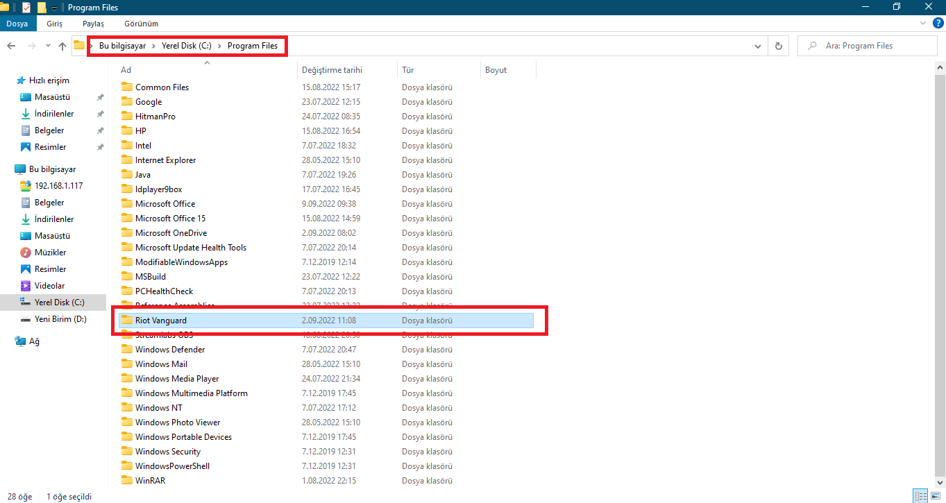 3- Bu adımda Windows'un kurulu olduğu C:/ bölümünü açıyoruz. Şimdi Program Files klasörünü açıp ordan Riot Vanguard klasörünü siliyoruz. Geri dönüşümden de silmeniz rica olunur.