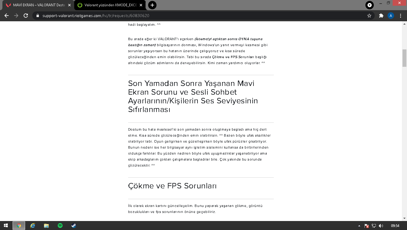 Vanguıardın vgk.sys adlı sürücüs Valorant sunucusuyla baglantıyı kesiyor bir ara Zula da BattlEye uzerınden hesabların ve IP adreslerının sunucuya baglanmasını engelleyen bir ban sıstemı vardı. Rica etsem bu sorundan dolayı mavı ekran alan arkadaşlar sıstem ozellıklerını oyun ıcındekı seslı ve yazılı konusmalarda kufur ve argo ıletısım kullanıp kullanmadıklarını herhangı bır hıle ya da PC'de cracklı bır dosya kullanıp kullanmadıgını yazabilir mi bir de en sonra olarak bilgisayarında Valorant düzgün bir şekilde çalısan birisi c/programfiles /riotvanguard yolundakı Vanguard klosorounu sanala yukleyıp lınkını verebılırmı vgk.sys sunucu baglantısını kesmesının bir sebebı olmalı ıllakı Riot loglarında surekli sunucudan bloklanıldıgı için vgk hata verıyor gosterıyor.