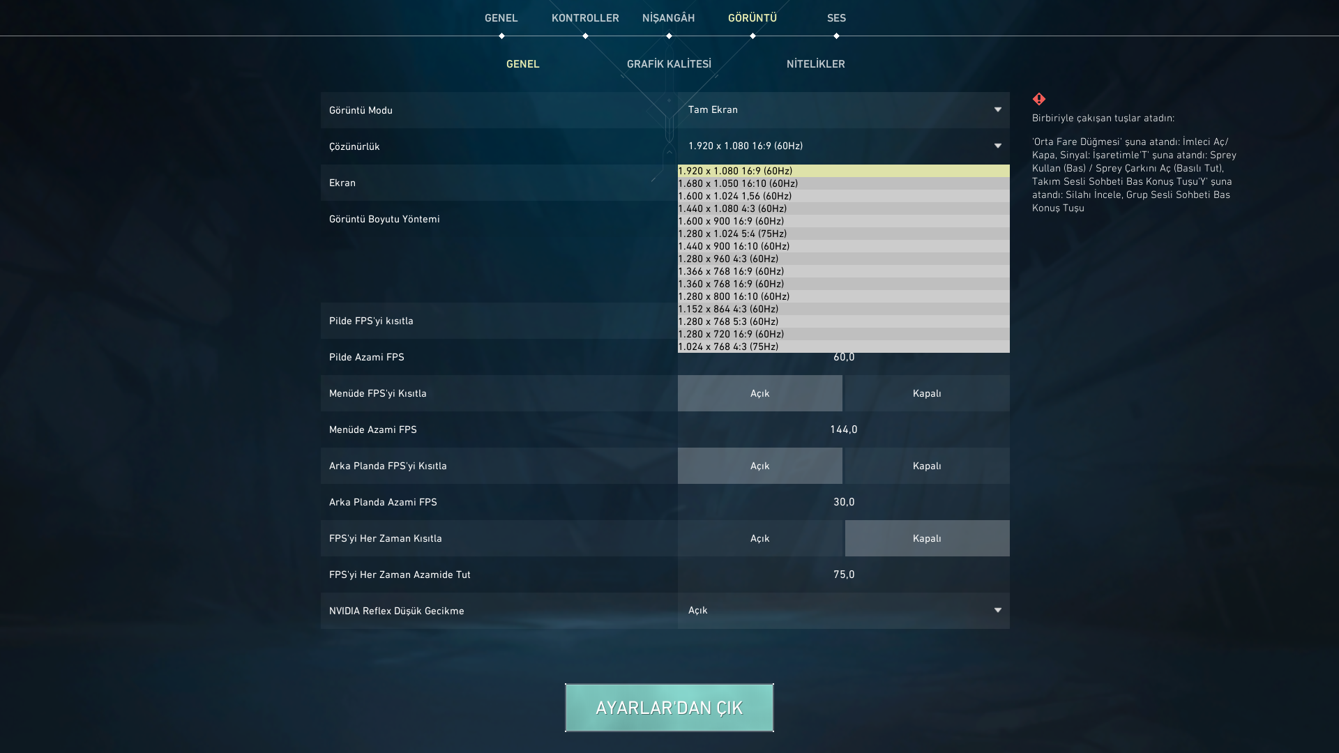 Monitörüm 75 Hz destekliyor. Ama görüntü ayarlarında 75 Hz gözükmüyordu. Bende o yüzden NVIDIA Denetim Masası'ndan ayar çektim ona. O şekilde 75 Hz kullanıyordum. Valorant'ta da 60 Hz gözüküyor. 75 Hz olması için 5:4 veya 4:3 çekmem gerekiyor. Ama 16:9 alıştım ben. Bunu nasıl düzeltebilirim? Normal bilgisayarımı 75 Hz olarak kullanıyorum ama oyunda 60 Hz kullanabiliyorum.