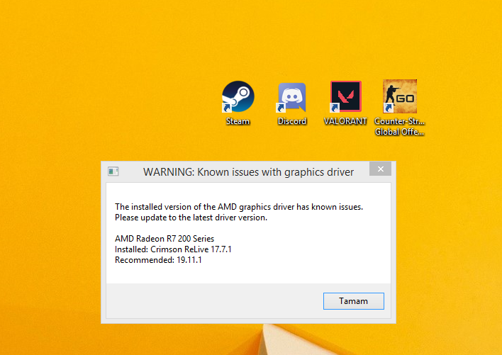 Ekran kartım güncel olduğu halde Valorant'ı açarken bana Windows 10 driveri öneriyor ama benim sistemim Windows 8.1 sl ekran kartımın kendi sistesinden en sonki driveri yükledim fakat Valorant'ta çökme oluyor. Önerdiği driveri yükleyemiyorum zaten tam olarak ne yapacağımı anlayamadım