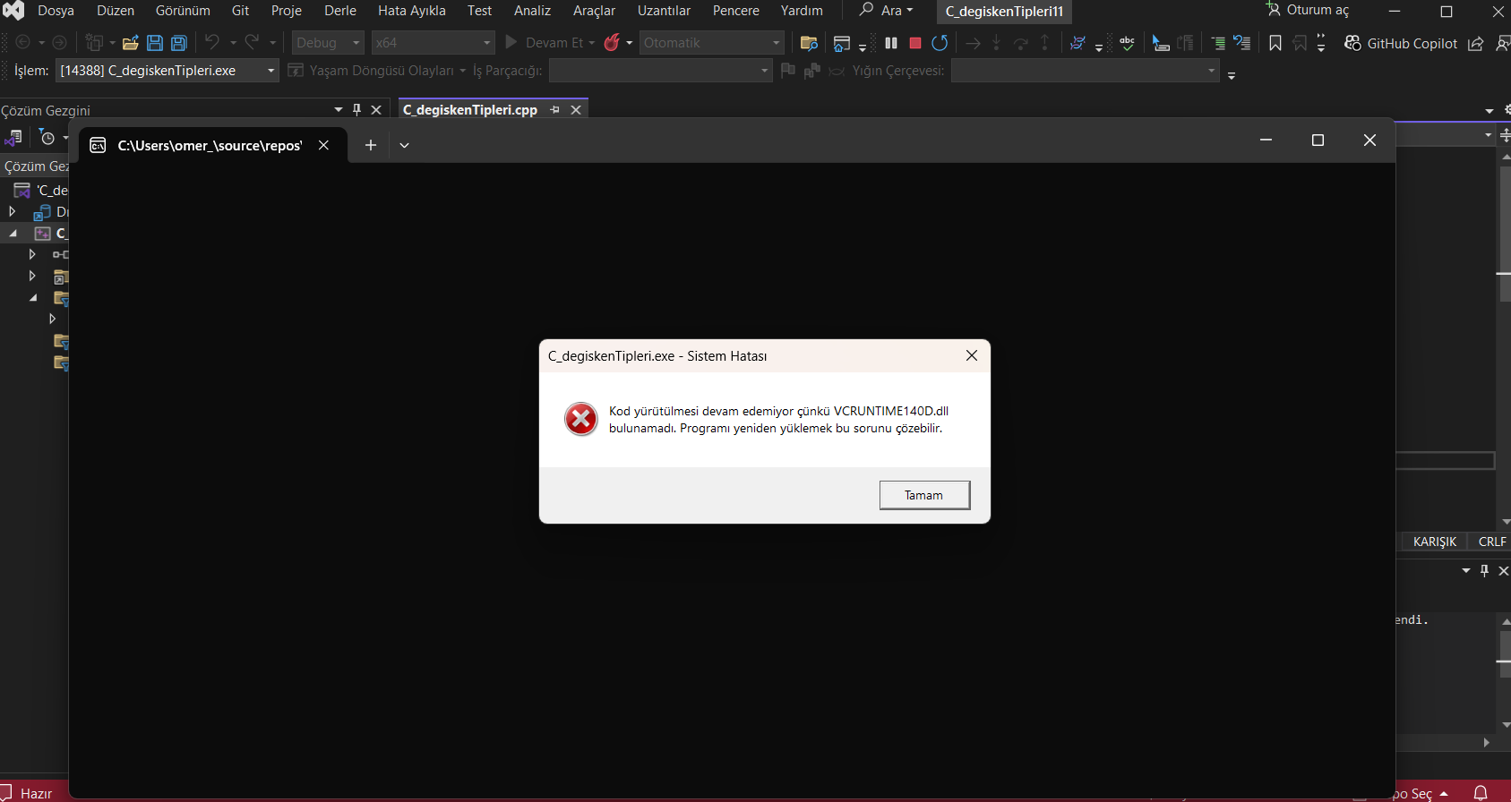 msvcp140d.dll bulunamadı şimdi böyle hata aldım, yeni proje açtım direkt hello world dosyası bir şey değiştirmeden çalıştırdığımda oldu.Bu durumda temiz Windows kurulumu öneriliyor.