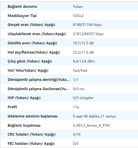Şimdi buradaki hat değerlerim nasıldır. Gün içerisinde siyah çelik koruyuculu kablo ile değişiklik yaptım. Eski kablo yumuşak ve kötü olduğu öğrendim. Dün akşam saat 10 da açık bıraktığım modemi saat gece 3.30'larda aktif kullanmama rağmen 5 milyon CRC aşağı olmuştu.