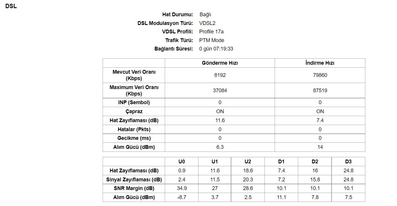 TT tarafında güncelleme yapılmadığı için sanırım böyle bir problem ile karşı karşıyayız, hat değerlerimi paylaşıyorum bilgili arkadaşlar kaç Mbps'de stabil olarak kullanabileceğimi söyleyebilir mi?