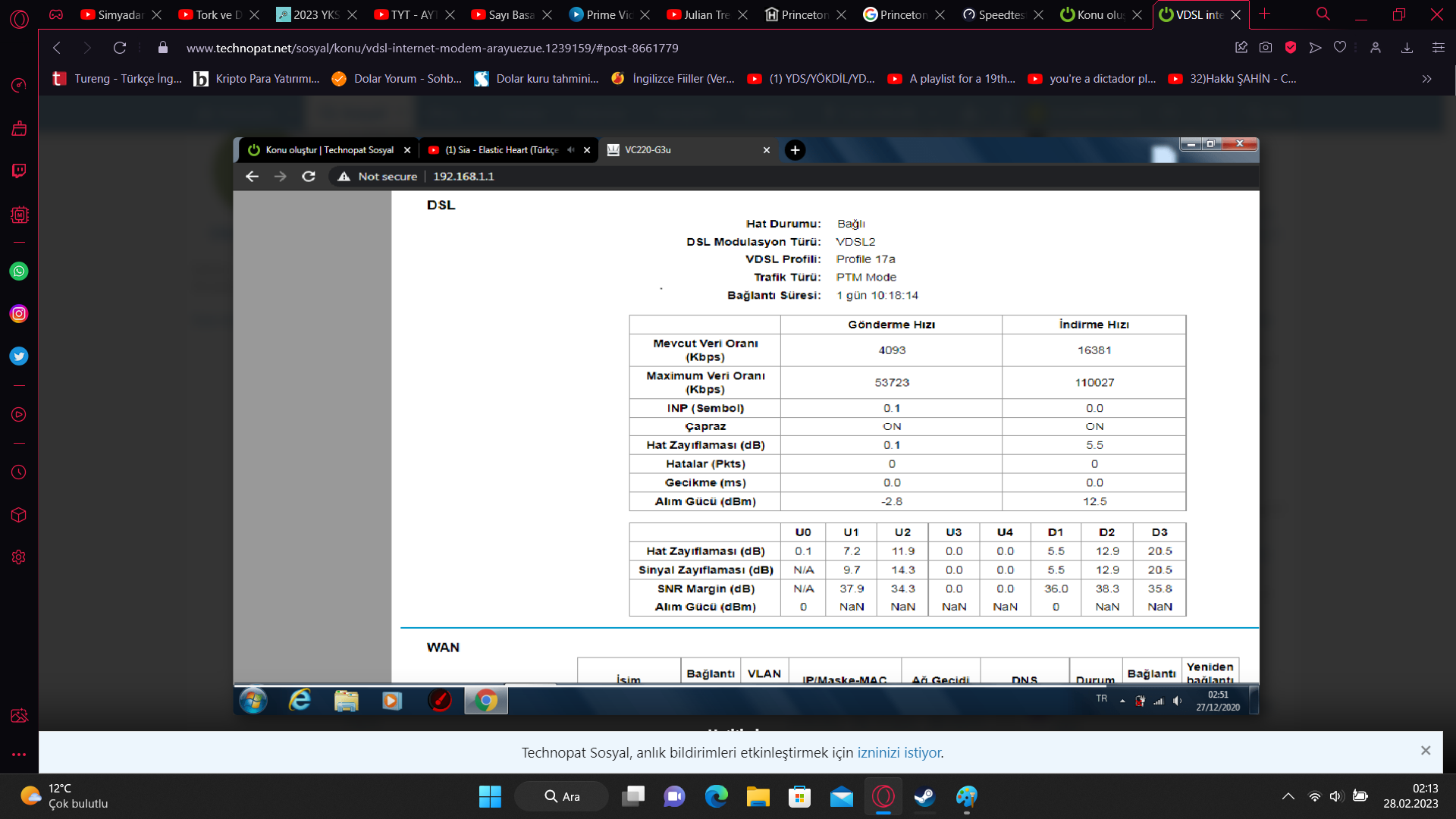 Arkadaşlar merhaba. Ben Türk Telekom kullanıcısıyım ve 50 Mbps'lik pakete geçmiş bulunmaktayım ama aklıma bazı sorular takıldığı için bilenlerinizin yardım etmesini çok istiyorum. VDSL hat kullanıyorum ve T7 tip kutu evime çok yakın. Ben 16 Mbps'lik paket kullanırken SNR margin değerim 32'lerde falandı fakat hız yükseltince akşamları 18 ama gündüzleri 13'e kadar düşüyor ve oyunlarda ani ping sorunuyla karşılaşıyorum. Sorum şu atacağım görselde 8 tane profil var ve ben sanırım D1 olanını kullanıyorum. U0 olanın değerleri çok iyi ve buna nasıl geçiş yapabilirim. Bu profiller port olarak adlandırdığımız bir şey mi ve müşteri hizmetlerini arayarak çözümleyebilir miyim?
