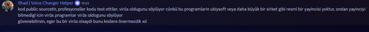 Ayrıca ses değiştirme programını indirdim fakat tararken 2 farklı antivirüs programında birden uyarı aldım. Programın paylaşıldığı aktif public bir Discord sunucusu orada öneren adminlerden birine sorduğumda bu şekilde cevap verdi: