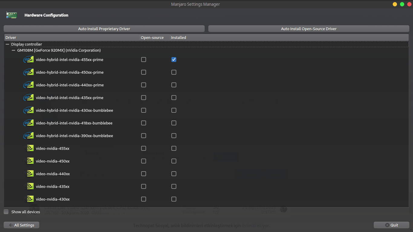 Yanlış hatırlamıyorsam bu ekran kartı ile o 455.45 driverında sorun oluyordu. Mümkünse açık kaynaklı olanı kurun veya biraz daha eski olan 425 veya 360 driverları kurmayı deneyin.