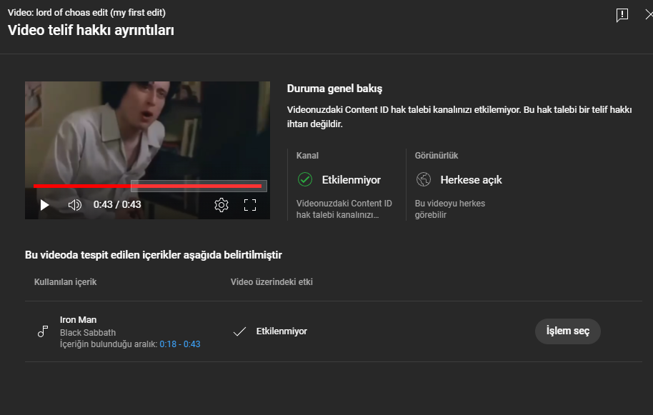 Bugün bu resmi editi yaptım şarkı olarak Black Sabbath Iron Man aldım (mantıklı olarak bunu oldum) tabii ki etkilenmiyor ama ileride sıkıntı olur veya telifi nasıl kaldıracağım?
