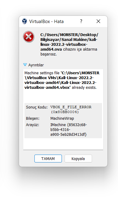 Selam, Kali Linux'u kurmak istiyorum fakat görseldeki hatayı veriyor. Ne yapmalıyım bilemedim. VirtualBox'ta Kali'yi de defalarca silip yükledim fakat düzelmedi. Sanallaştırma da açık. Bilen var mı?