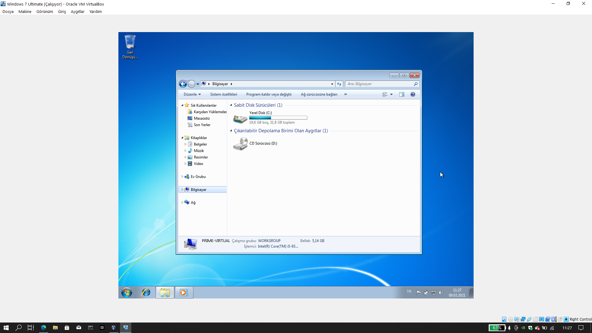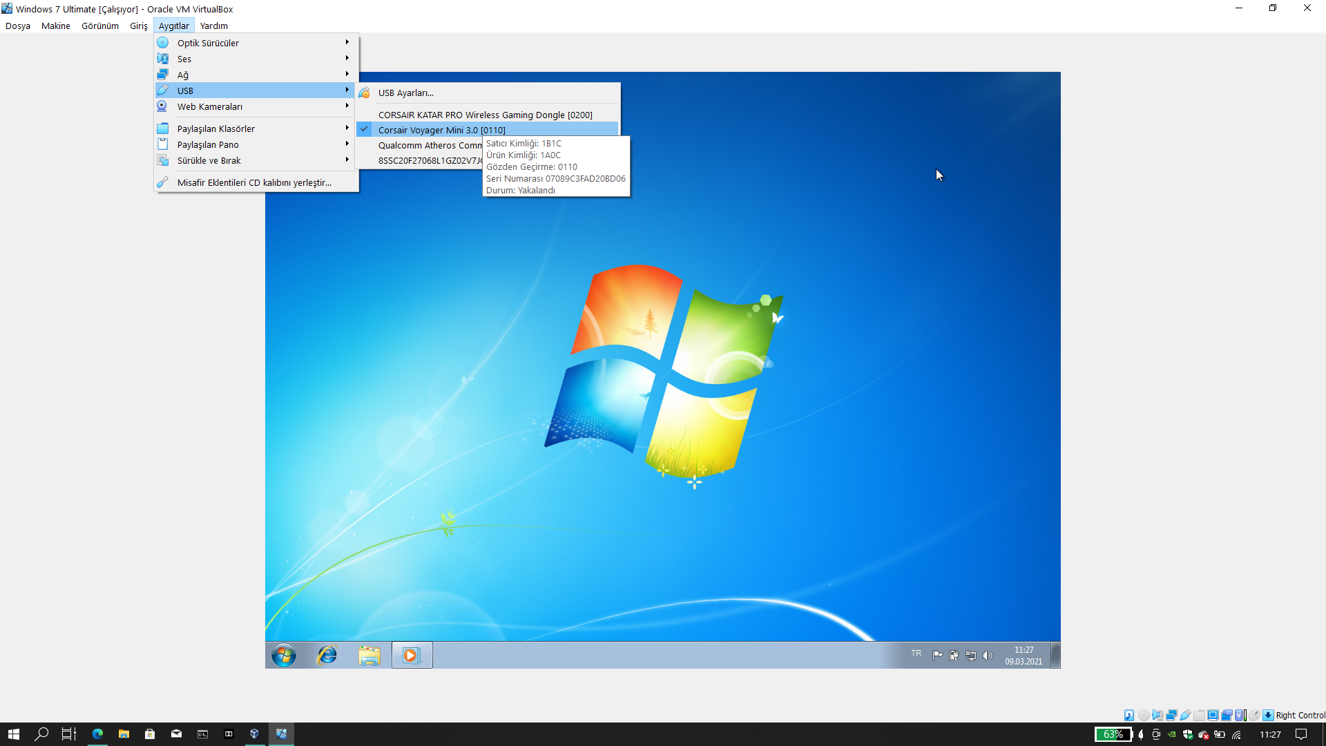 Durum göründüğü gibi. USB belleğim görülmüyor. Extension Pack kurulu. Üstteki menüden bağladığımda Windows 10'dan gidiyor. Buna rağmen Windows 7 USB Belleği görmüyor. (Disk yönetiminde de görünmüyor)