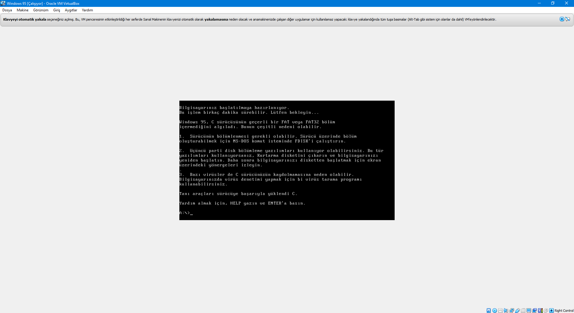 Virtualbox uygulaması ile Windows 95 kuruyordum ama şöyle bir hata çıktı: