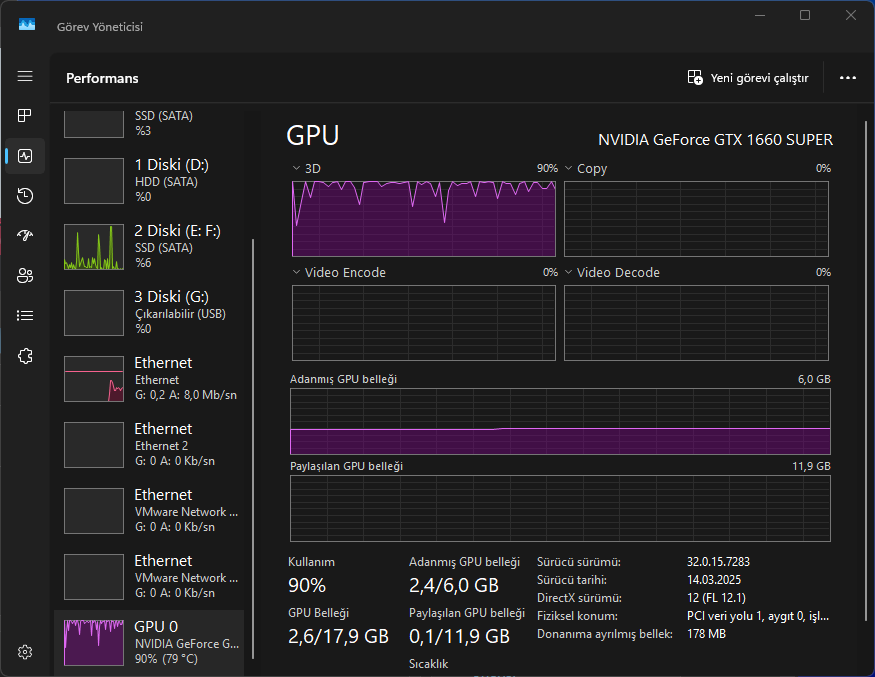 Merhaba, ben test olarak bir PC oluşturdum vm olarak ama tgörev yöneticisinde GPU %100'e vuruyor resimde de görüldüğü gibi.