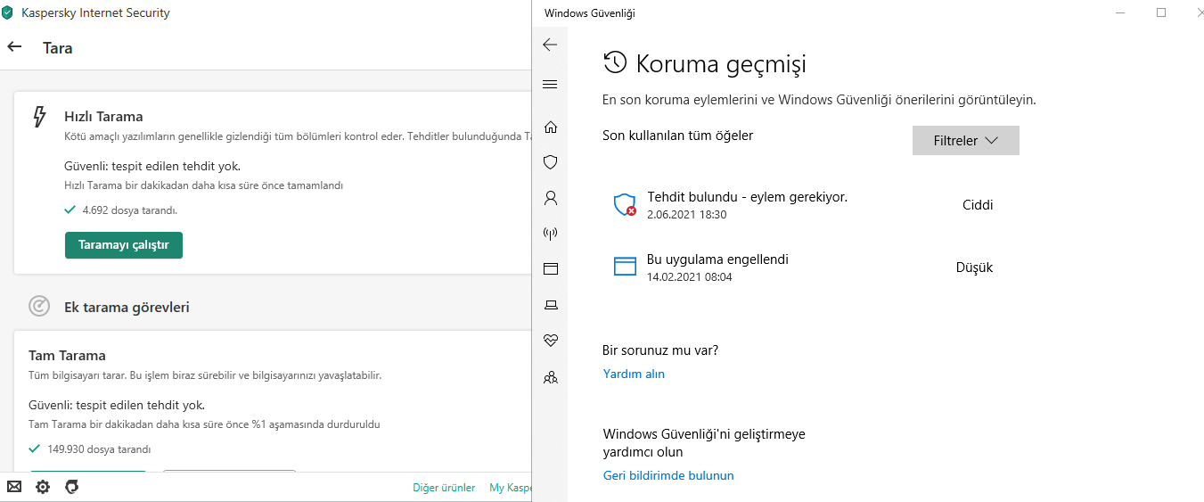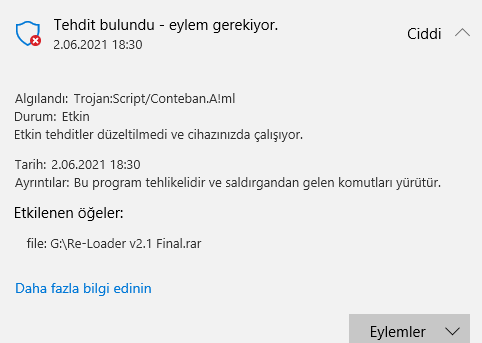 Sonra kaldır dedim, Windows defendera ama tekrar tarattığımda tekrar aynı virüsü gösterdi, tekrar kaldır dedim, tekrar virüsü gösterdi...