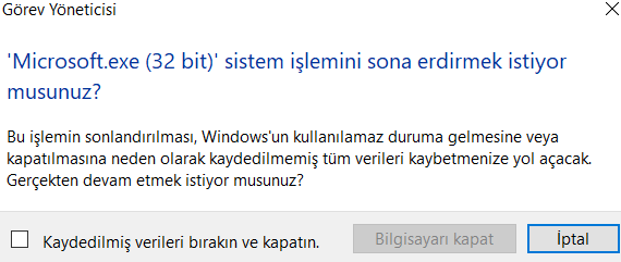 Görev Yöneticisi'nden kapatmaya çalışınca böyle diyor.