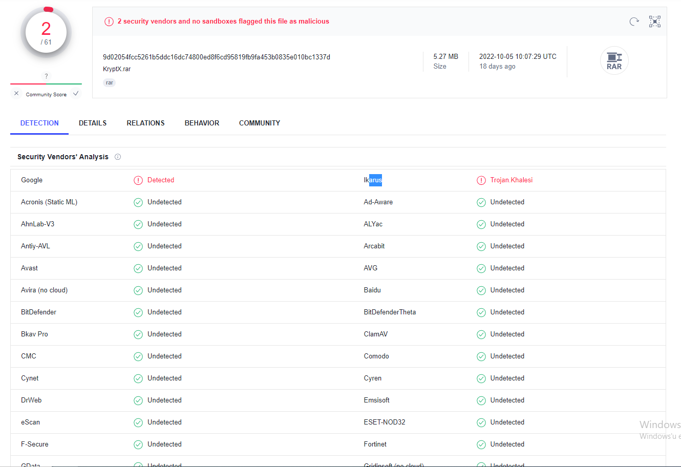 Mk11 Türkçe yama arıyordum ve neredeyse tüm yorumları olumlu olan bir video bulup denemek istedim. VirusTotal'de dosyayı indirip tarattım fakat aşağıdaki gibi bir hata verdi. Bu virüs müdür yoksa yama vs olduğu için mi böyle hata verdi? Bir de bilgisayara indirdikten sonra RAR dosyasını açtım sonra kapatıp sildim bir zararı olur mu?