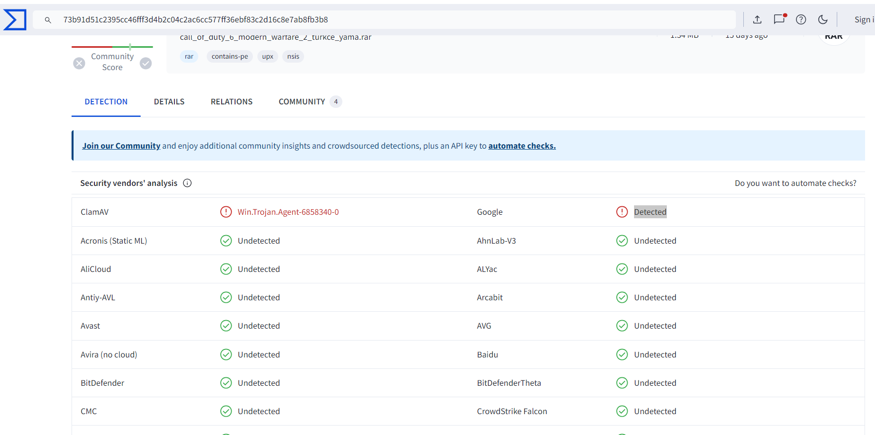 İyi akşamlar herkese. Call of Duty Modern Warfare 2'nin çevirisi için oyun çeviriden indirdim. Herkes güvenli diyor ama emin olmak için VirusTotal'den tarattım. Clamav virüs buldu. Güvenilir mi? Çeviri dosyasını kurmalı mıyım?