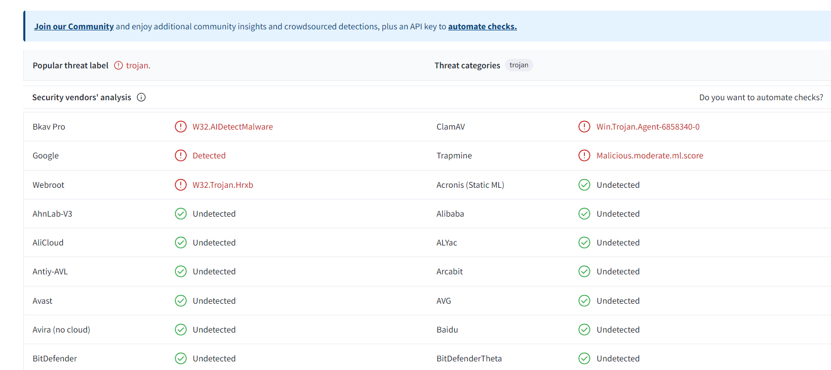 Örnek: Malwarebytes, Kaspersky, ESET, BitDefender, Sophos, Avast!, belki Windows Defender (VirusTotal'de Microsoft diye geçiyor galiba).