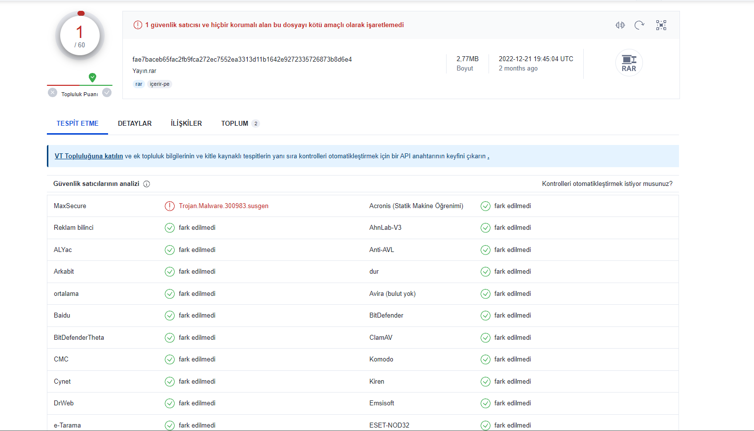 VirusTotal'de bir dosyayı tarattım ve böyle sonuç verdi, ne diyorsunuz virüslü mü?