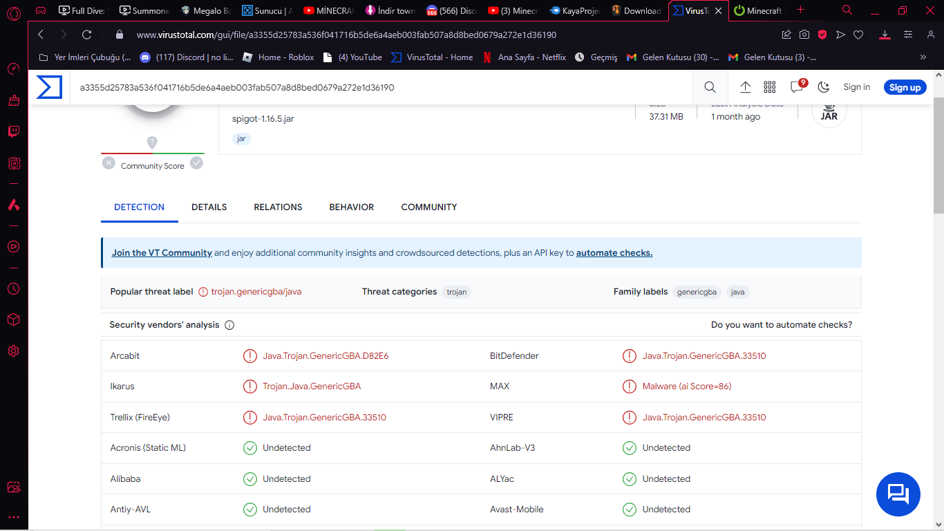 Buradan mı indirdiniz? Getbukkit güvenilir bir kaynaktır, buradan indirmediyseniz buradan indirin. VirusTotal sonucunu link olarak paylaşın, eylemlerini inceleyelim.