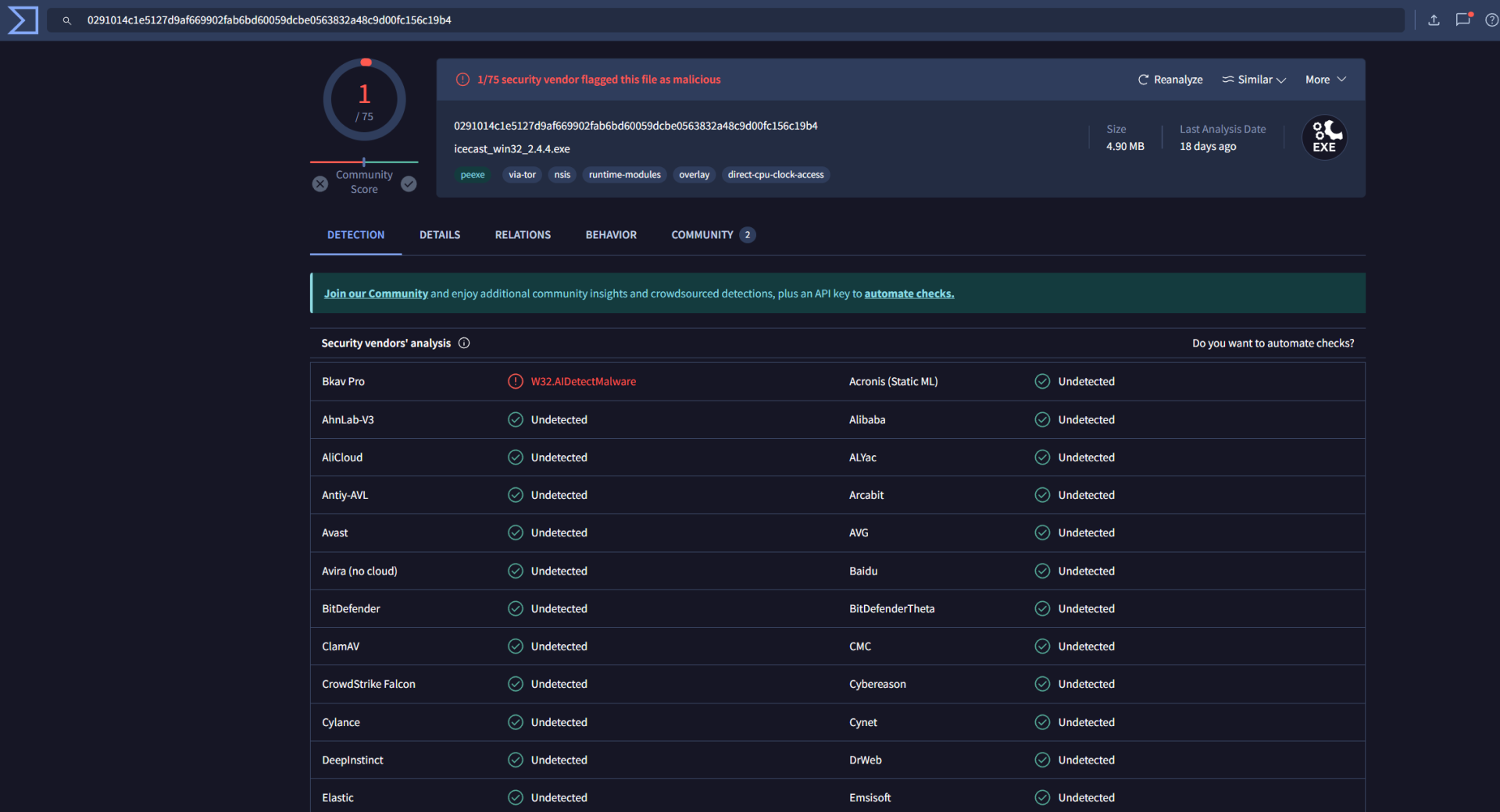 Merhaba öncelikle. İcecast isimli radyo programını indirdim ve kurmadan önce taratayım dedim. VirusTotal'e attığımda sonuç aşağıdaki gibi çıktı, sizce güvenilir midir?