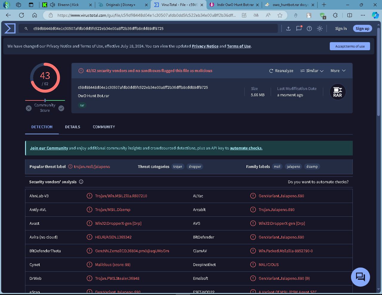 Discord'dan biri DM yazıp Owohunt bot diye kandırmaya çalışıp attığı dosya bu taranmış hali vrüs olmadığını iddia ediyor adam sizce virüs var mı