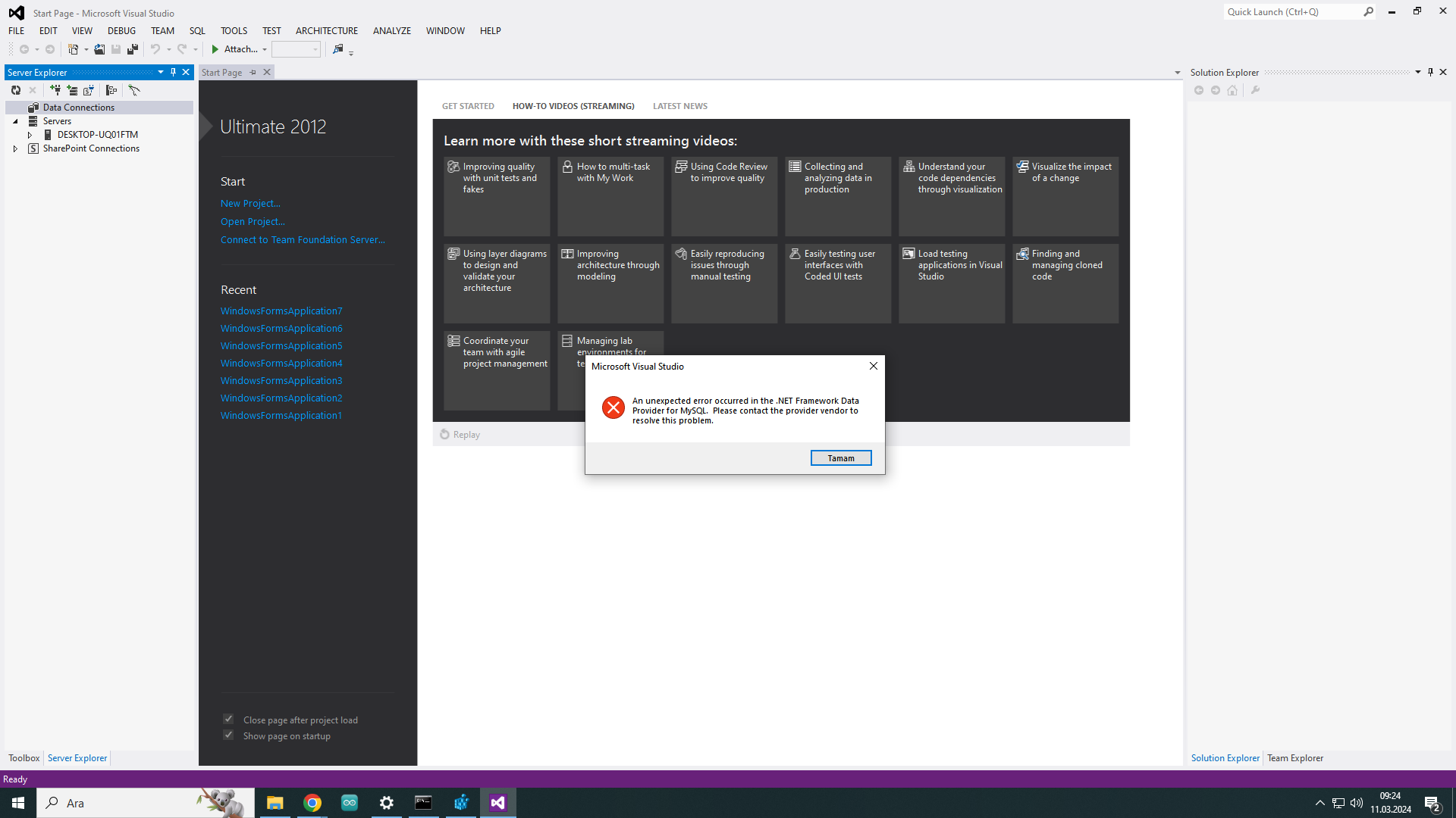 Visual Studio "an unexpected error occurred in the .NET Framework data provider for MySQL" hatası
