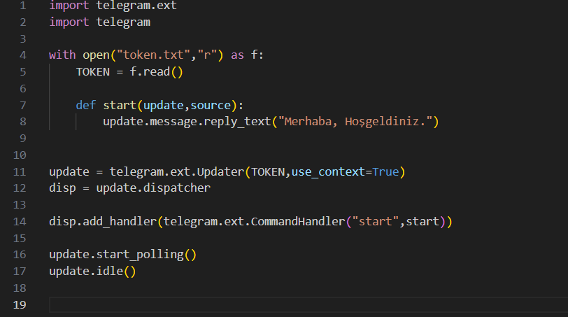 Yeni ogreniyorsan baslangic yolun hatali. Telegramla, dispatcher ile, polling ile isin yok baslangicta.