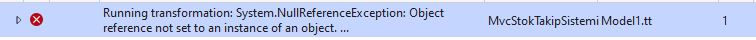İşin garibi ilk resimdeki sorunsuz çalışan modelin olduğu projeye yeniden bir entitydb first modeli ekliyorum ve onda da aynı sorun oluşuyor. Modeli düzgün çalışan veritabanını yeni bir projeye tekrar eklemeyi denedim durum yine aynı oldu. Ve modeli eklediğimde ek olarak bir hata geliyor.