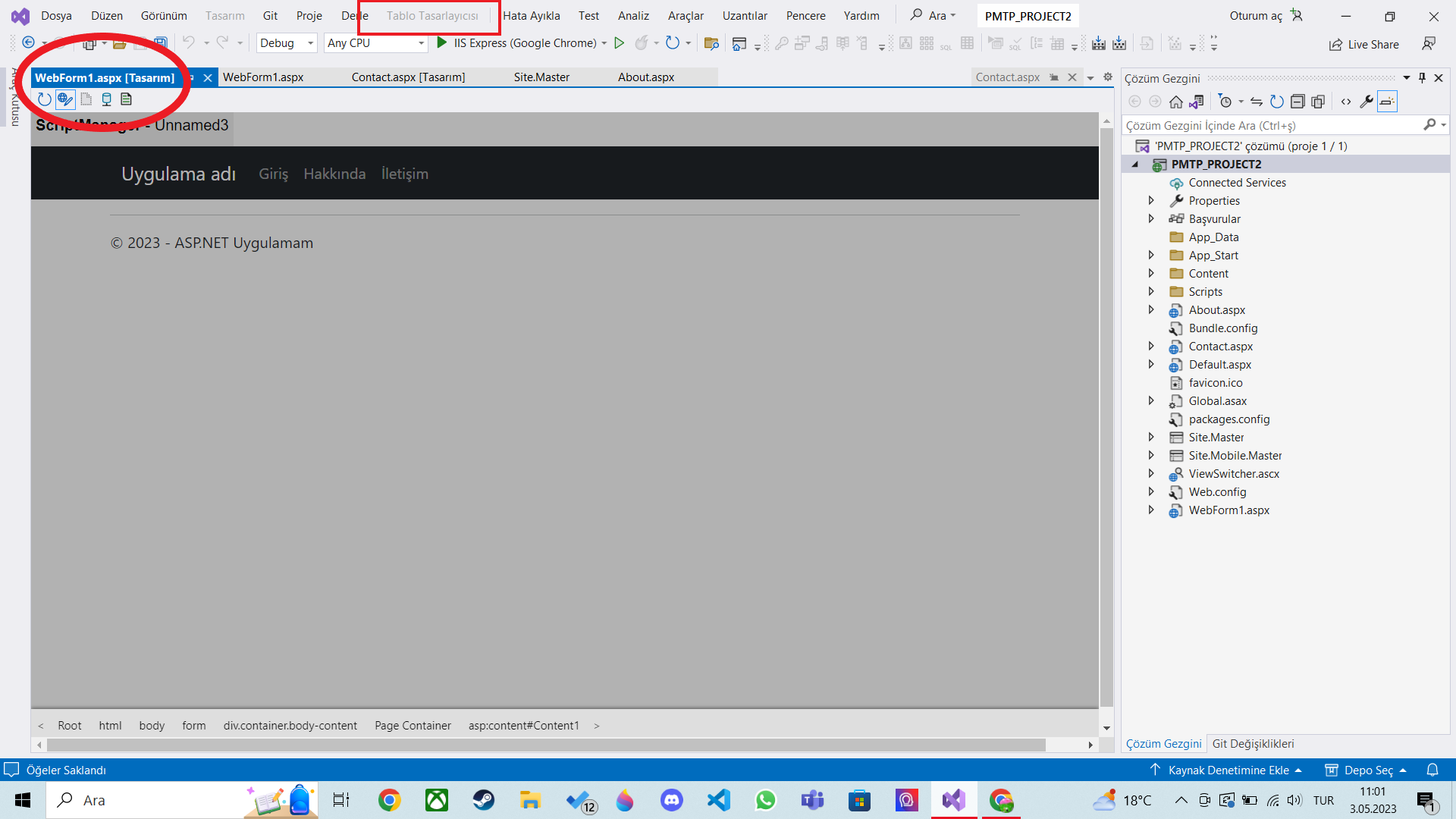 Şu an Site master'ın tasarım modundayım ve hala aktif değil. Hatta eklemek gerekirse tablo tasarımcısı seçeneği dün direkt hiç yoktu. Sınıf arkadaşım site master'a tıklamamı söyledikten sonra yukarıda çıktı ancak bu sefer de tıklayamıyorum.